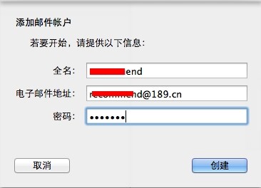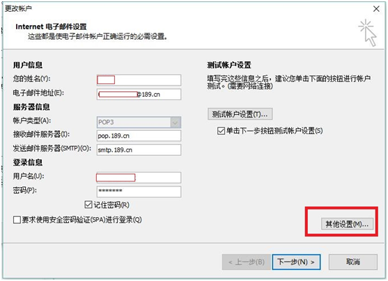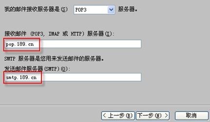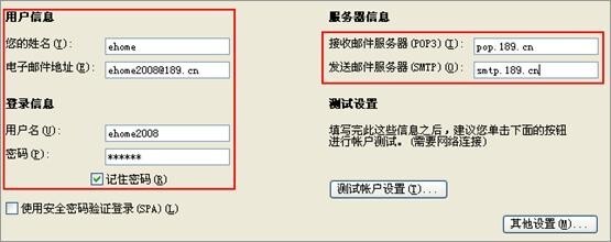 输入您的姓名、电子邮件地址、用户名、邮箱专用密码(你邮箱的登录专用密码),输入"189邮箱" 的 POP3 和 SMTP服务器地址;
