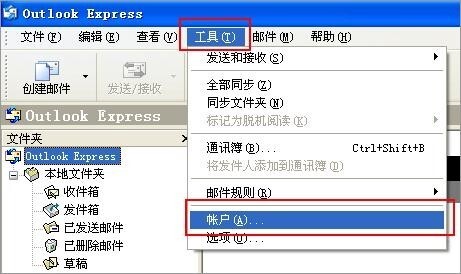 请首先打开Micrsoft Outlook,然后点击"工具"菜单下"电子邮件账户";