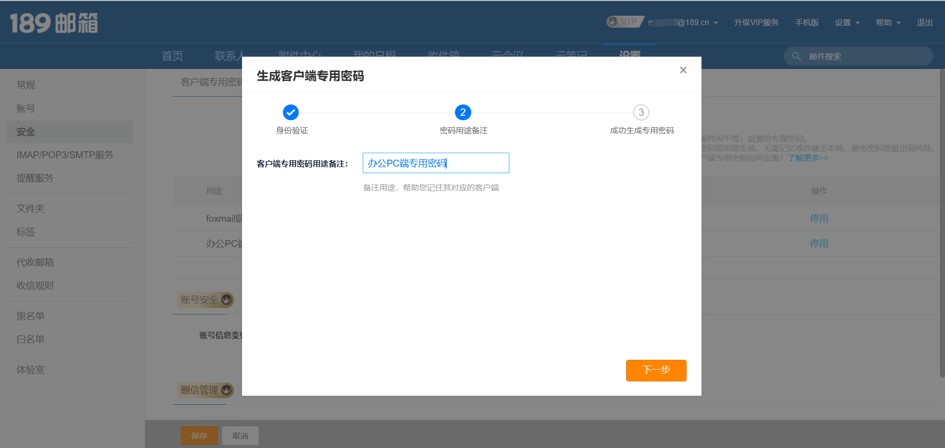 您同时使用多个客户端,为进一步保障端安全,建议您为每个客户端配置独一无二、且均不与邮箱密码相同的专用密码,可在用途处备注所使用的端。(系统支持生成最多10个客户端专用密码)