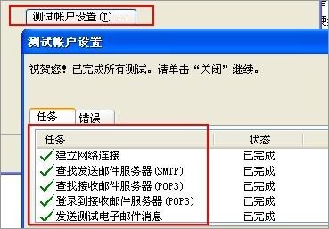 接着点击"测试账户设置",可测试当前的账户是否设置成功,点击"完成"按钮保存您的设置;