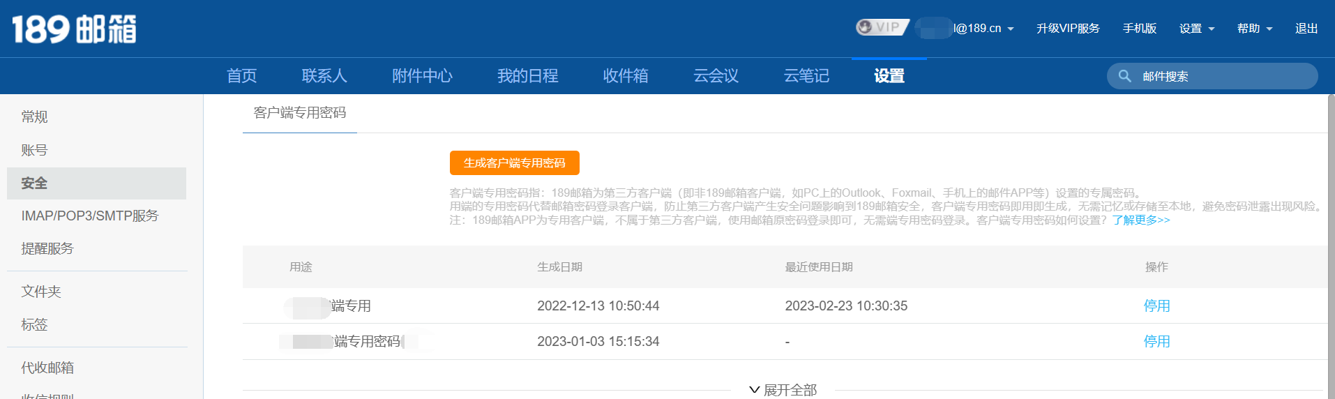 专用密码仅在生成成功后显示一次,不能再次查看,建议您需登录第三方客户端时生成即刻使用,随用随生成,;如需停用此条专用密码,可在生成客户端专用密码下的记录中找到该条记录,选择“停用”,停用后此专用密码不可再登录,如需使用重新生成一个即可。