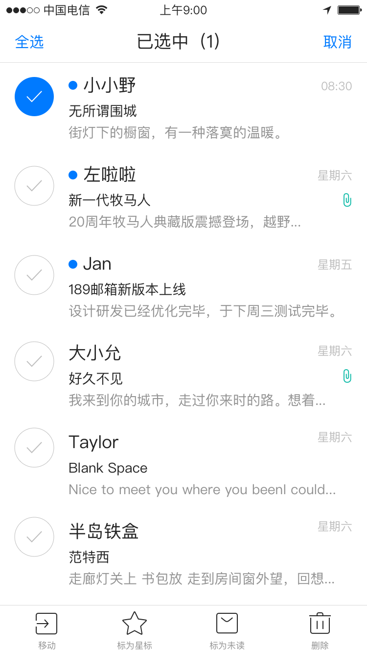 在收件箱页面,点击邮件列表头像,可进入对邮件进行批量处理。批量标记已读、未读,批量删除。