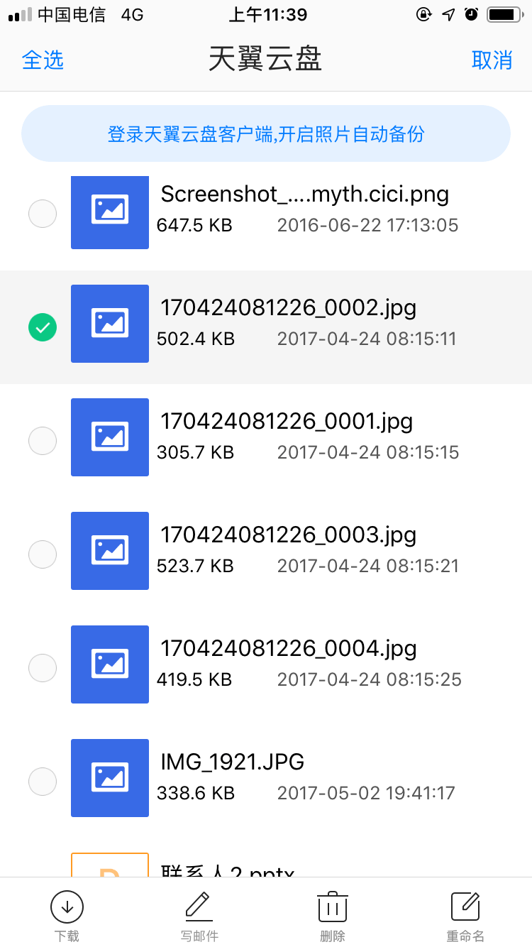 长按列表文件附件。可选择下载/写邮件/删除或重命名文件。